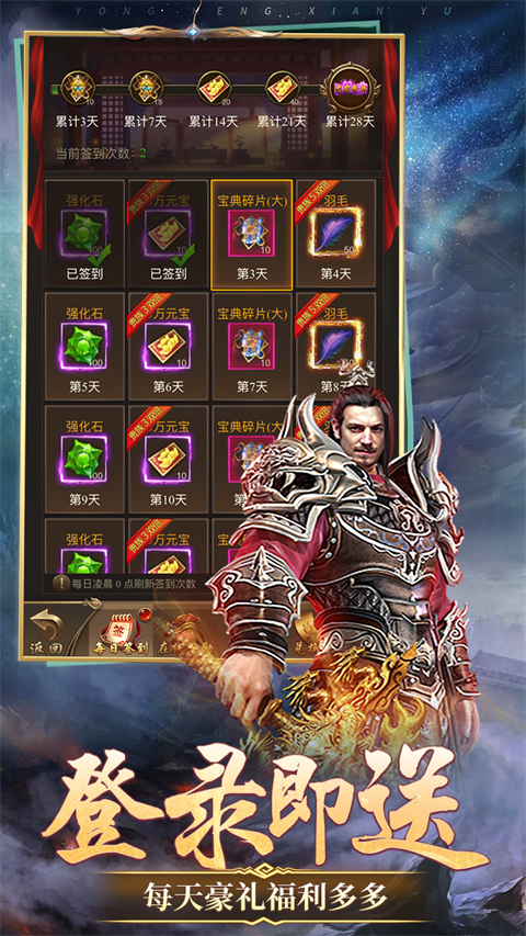 通过每日签到,可以获得大量元宝和超多资源,而在线奖励每日可领取五十万元宝奖励。