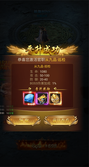 7、官职系统可以增加对boss的特殊伤害,与爵位系统一样,可以着重升级,虽然小怪也可以掉落神器,但是boss的概率总归是比小怪更大。