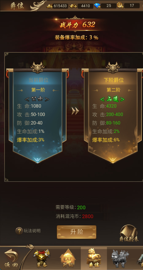 1、在条件允许的情况下,先升级“爵位”,爵位不仅可以给你带来可观的属性加成,更重要的是可以增加掉落爆率,可以帮助你获得品质很高的武器。
