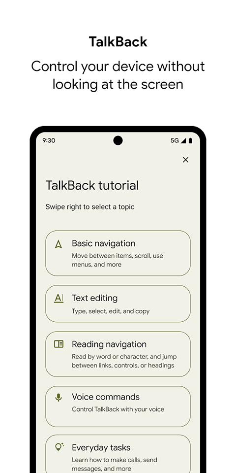4、TalkBack 屏幕阅读器:获得语音反馈,使用手势控制您的设备,以及使用屏幕盲文键盘输入。