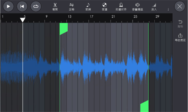 4、你可以对当前音频进行裁剪、反转、变速变调等操作,每操作一次都会记录缓存,所以你可以撤销到上一步重新做。你也可以将当前选区导出为音频,软件将会同时导出wav和音频数据文件,wav文件你可以在“我的音频片段"文件夹找到。