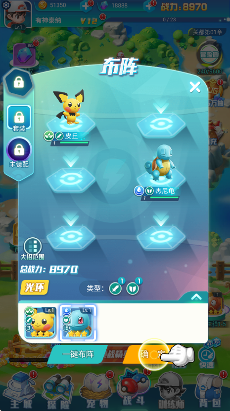 3、玩家获得新的精灵,需要将其编入队伍才可参与战斗,需要注意的是,游戏分为前后排,杰尼龟拥有高防御,属于前排精灵。