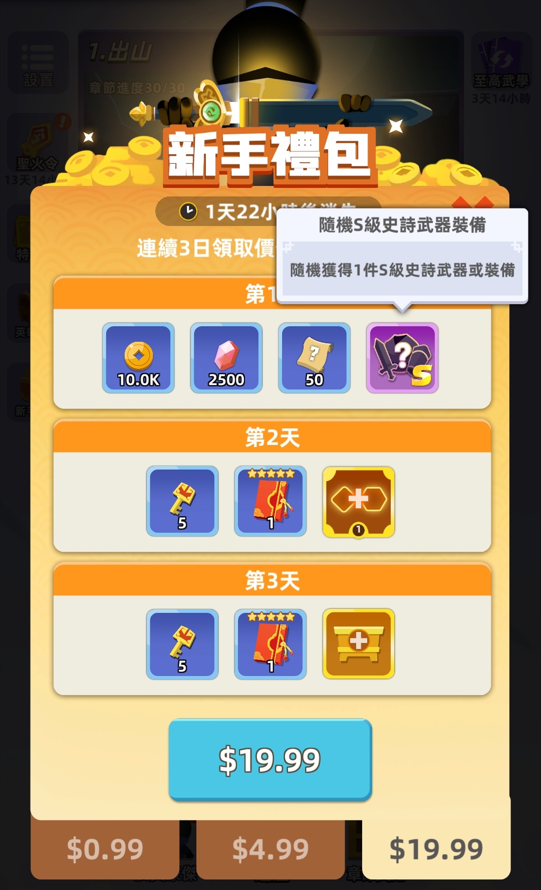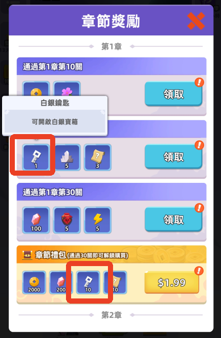 4、章节奖励或章节礼包同样的也可以获得白银钥匙在白银宝箱内抽装备,这个方法获得的钥匙比较少。