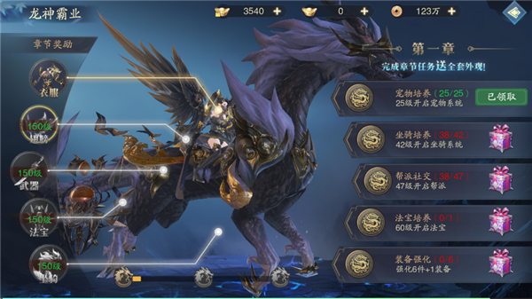 玩家完成章节任务可领取全套外观以及坐骑龙王,可以极大提升战力。