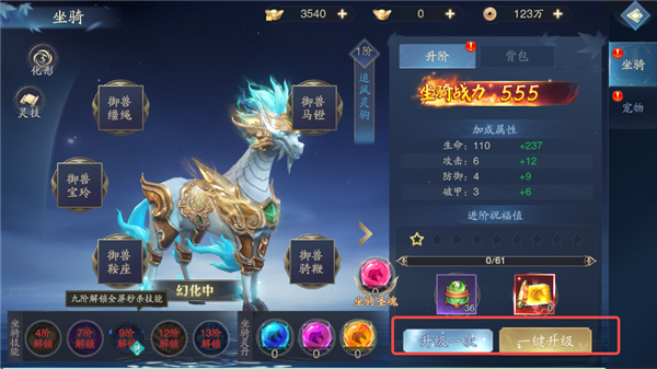 坐骑升级不仅可以提升生命、攻击等属性,还可以解锁坐骑技能,拥有更强战力。