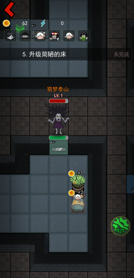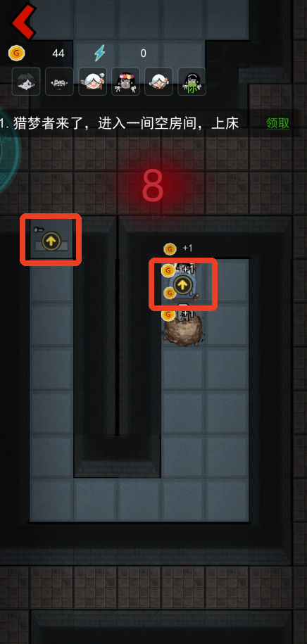 3、躺到床上之后点击黄色的小箭头可以升级自己的建筑,规划好金币的使用,我们需要做的就是保护好自己,不要让猎梦者攻击到我们。