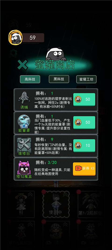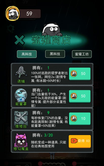 7、获得的奖励可以在蜜獾商店购买道具,这样下一关的胜算就会更大一些。