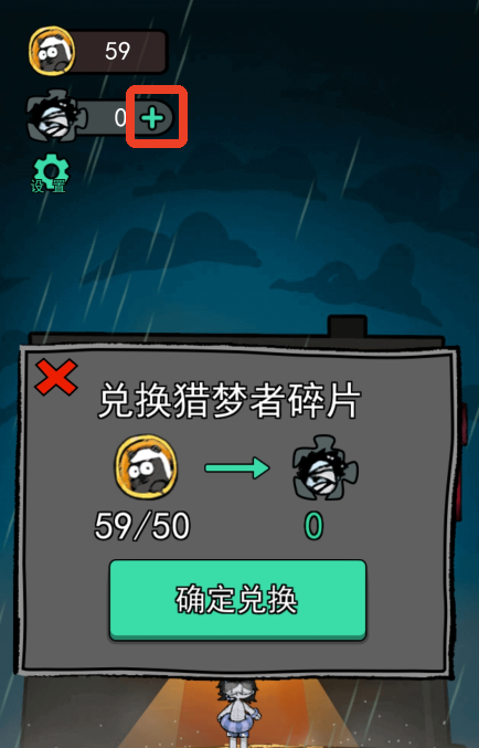 2、之后来到游戏主界面,点击左上角绿色的+号可以用对局奖励兑换猎梦者碎片,50奖励兑换一个。