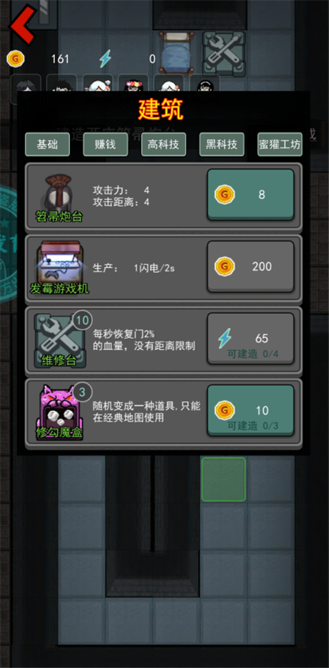 5、点击空白位置可以建造新的防守建筑,建议在门口布置有攻击性的武器然后猛猛升级。门能升级就升级,要是门没了猎梦者很容易就能攻击到你。