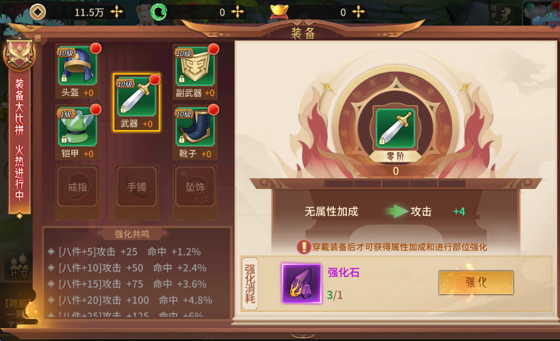 4、装备更好的武器就可以明显提高战力,并且装备成套可以触发共鸣效果,获得额外的属性加成,给装备强化也自然是不错的选择。