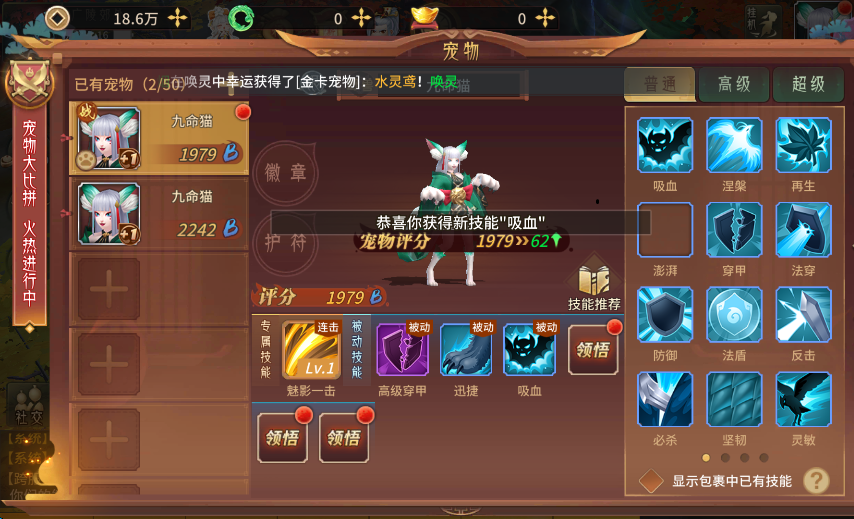 5、宠物的可塑性更好,玩家可以从给宠物洗髓,以获得更好品质的宠物,并且宠物可以使用技能书领悟到新的技能。