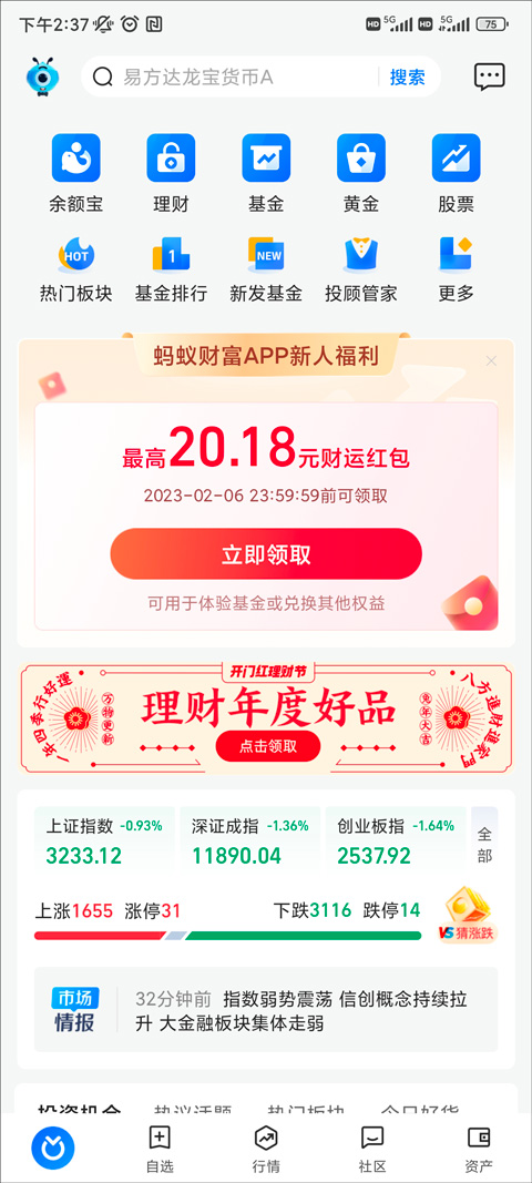 蚂蚁财富拥有财经资讯、市场行情、社区交流、智能理财顾问等服务,用户可随时随地了解金融行情,操作也特别简单,能够使用一个账号,在蚂蚁财富平台上实现余额宝、招财宝、存金宝、基金等各类理财产品的交易,让理财实现“小确幸”。