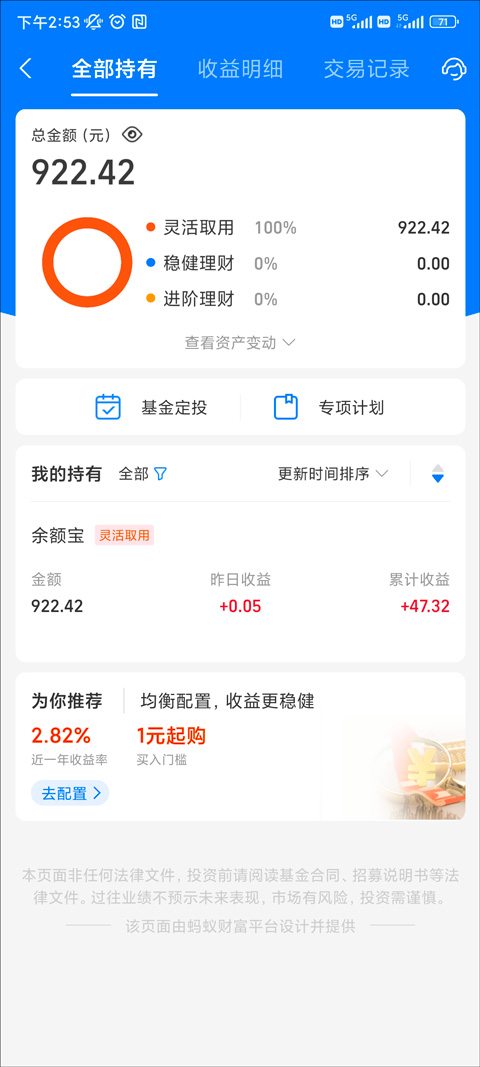 3、在我的资产详细中可以看到全部持有、收益明细、交易记录等等;