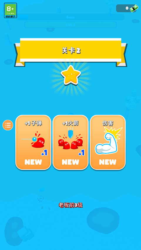 新手攻略:拖动即可移动,自动攻击,lv值满时可选择加成 BUFF 变强,灵活走位边射边躲,射击到一定数量后迎战 BOSS。打敗 BOSS 即可过关并获得奖励。