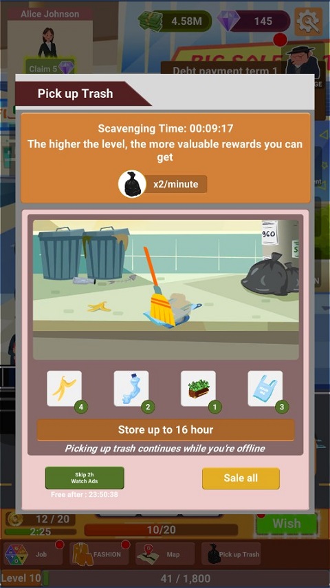 此外,游戏内还有许多工作性质,包括清扫,手工制作等等,待满足以上条件后你便能源源不断的创造财富,早日实现东山再起。