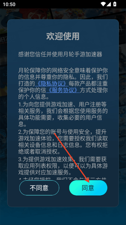 1、在本站下载安装月轮手游加速器官方正版,运行软件并同意权限;