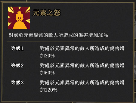 ——对受元素异常影响的敌人提供伤害加成,1级30%,2级60%,3级120%。