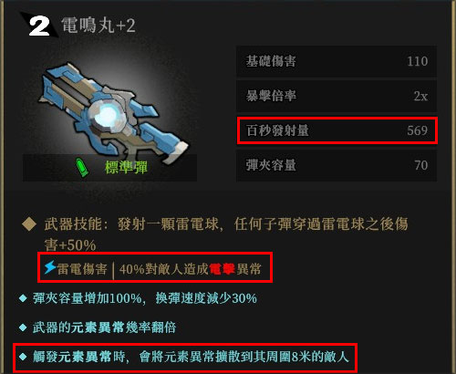 这是一把火属性的手枪,配合太子的烟雾手雷可以打出混合异常——爆炸,对于前期清理大堆怪物十分好用。同时烈焰弹丸作为单点式的手枪,攻击敌人的弱点部位时可以造成极高的伤害,非常适合神射手的你!