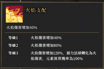 火焰:源力法球转化为火焰伤害,元素异常几率为100%