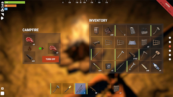 7、先不要急着造家,因为每个服务器的地图都是随机生成的,所以一开始,我们应该到处走走,找物资刷新点(大铁球,工厂,核电厂,卫星雷达,峡谷等),随机看运气,看看会碰到什么辐射区,比如我就走到了大铁球,找到辐射区之后,立即拿你的石头去砍树10下,采集100木头,然后捡地上身上的“麻类纤维”,采集30个布,然后打开背包制作一个睡袋,放到快捷栏。