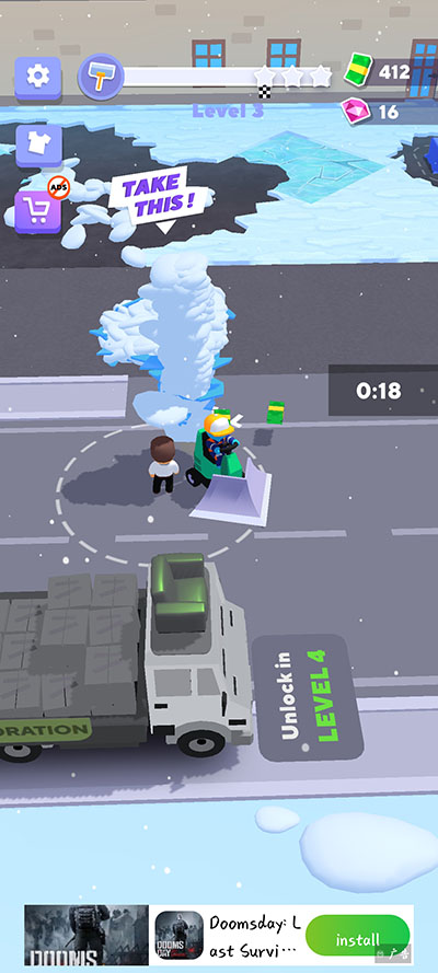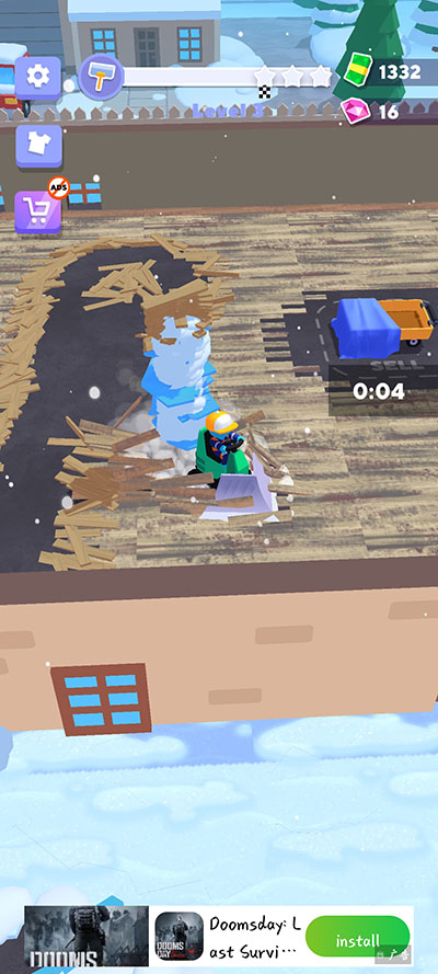 3、在清理的过程会自动收集地面上的各种物品,比如冰块、木板等等,但是容量是有限的,达到最大承载力时需要前往指定的地点将收集而来的各种物品进行出售,
