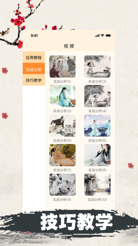 3、进入【教程】界面,包括“应用教程”、“实战分析”、“技巧教学”等视频栏目,用户可选择对应的视频进行观看学习,