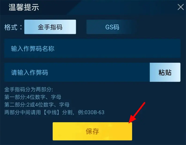 输入名称代码,点击保存,这样即可输入金手指成功。