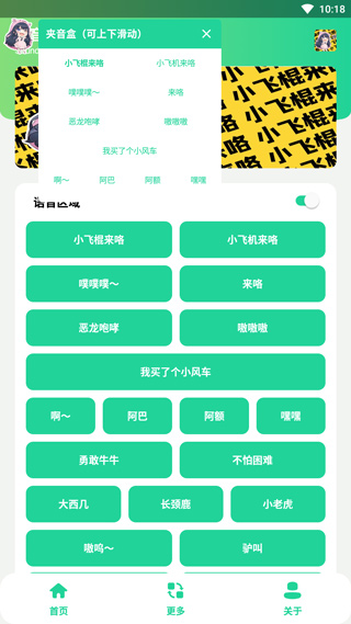 这款夹音盒最新版真的太有趣了吧!打开软件就能看到各种搞笑的语音按键,像“小飞棍来咯”、“我买了个小风车”这些音频听着就让人忍不住笑出声。界面设计得很简洁,操作起来也很方便,点一下按钮就能听到对应的声音,完全不用费劲找。