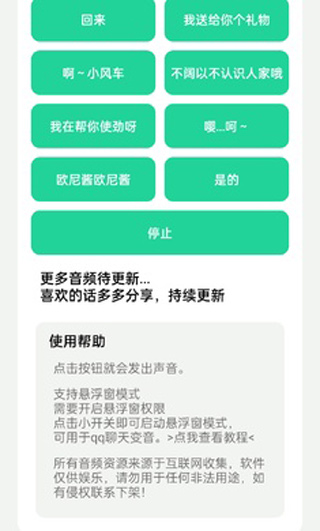 4、所有音频资源来源于互联网收集,软件仅供娱乐,请勿用于任何非法用途,如有侵权联系下架!