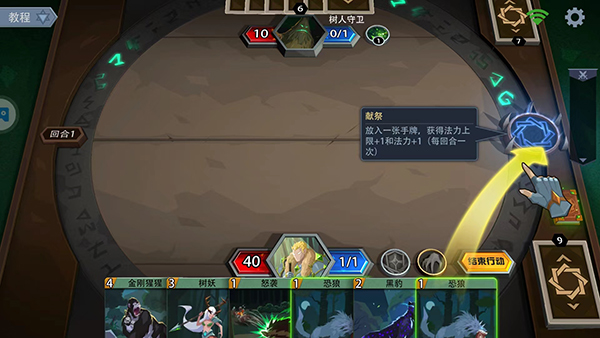 10、献祭卡牌可以增加一点法力和法力上限,只需要将卡牌拖到到右方蓝色盘中即可,