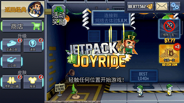 这款叫做《疯狂喷气机》的最新版本游戏真的挺有意思的!游戏背景设定在一个神秘的工厂里,玩家扮演主角Barry,为了阻止科学家的阴谋潜入工厂,偷走他们的个人火箭飞行器。在逃亡过程中,你需要躲避各种机关、电网和导弹,玩起来非常考验眼力和手速。画面也很清爽,场景切换流畅,金币和道具的设计让人感觉特别炫酷。