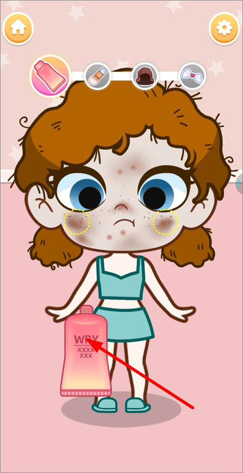 2、进入游戏页面,换装顺序是从脸部开始,按照手指指示,移动游戏中的物品帮她清理污渍;