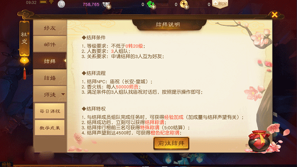 结拜3人为一组,每个角色只能有一组结拜关系。等级达到20级后,互为好友的3人,就可以组队到长安-皇城找庙祝结拜,队长会默认成为结拜中的老大。结拜后,会开启结拜声望,可通过结拜成员组队完成日常任务时掉落的“金兰谱”来提升。根据结拜声望,可获得经验加成。