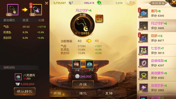 角色的装备中有五件可以转化成为仙器,五件装备分别是武器,帽子,衣服,项链和鞋子。装备转化成为仙器后,各项属性都会得到非常大的提升。