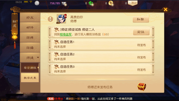 拜师收徒方法,可二人组队至长安皇城的NPC“李林甫”处,结为师徒关系。结为师徒的玩家,可以通过完成每日课程和教学成果,来获得大量奖励。每日课程由师傅发布,师徒共同完成,每日5点刷新。当徒弟等级达到60级是,即可在“李林甫”处,或教学成果界面处出师即可。徒弟出师后,双方师徒关系,不能再解除。