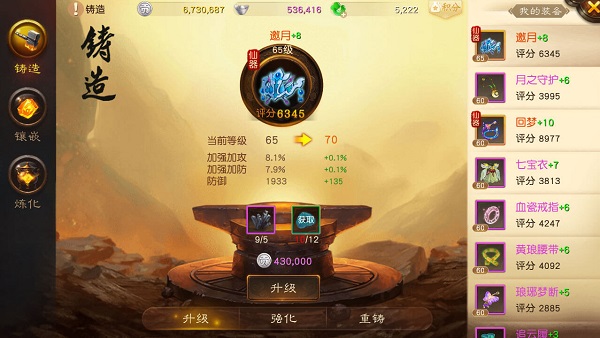 玩家在游戏中可以获取一定的装备材料对装备进行升级,装备升级后,各项属性都会得到一定的提升(注:装备等级不能超过角色的等级)。