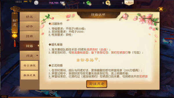 当游戏内互为异性的双方情投意合,且等级、友好度达到要求,等级不低于0转50级和好友度不低于2000点,就可以前往长安找月老处,选择吉时结婚。在月老处定下良辰吉日后,准夫妻还可挑选喜帖类型、备下亲友红包、预约花轿游行等婚礼详细条目,为浪漫的典礼做足准备。