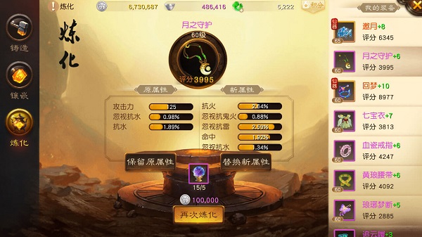 玩家在游戏中获取一定的炼化材料可以对装备进行炼化,装备炼化后可以增加额外的属性,若玩家对于此次炼化获得的属性不太满意,还可以对该件装备进行反复炼化,直到获取自己满意的属性为止。
