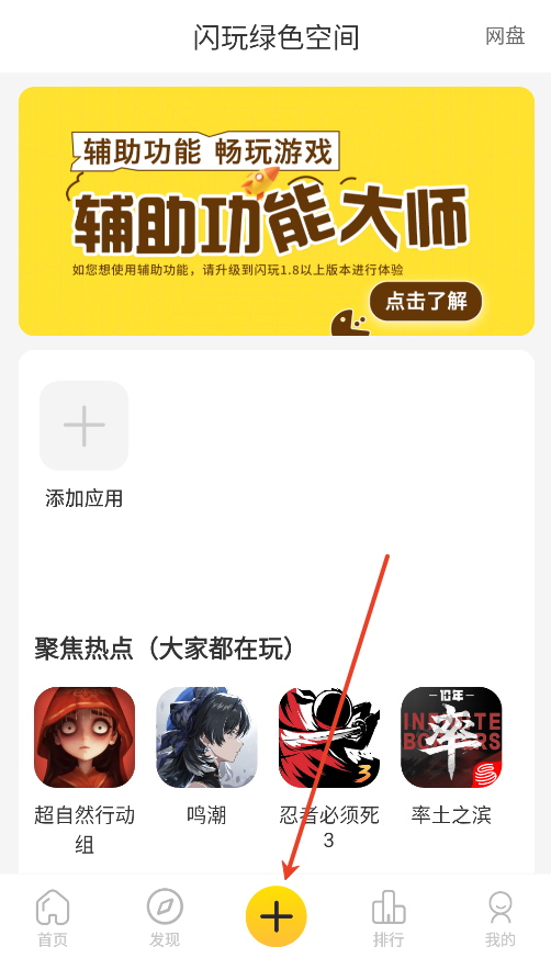 1、安装闪玩App,点击“+”号,进入闪玩绿色空间。