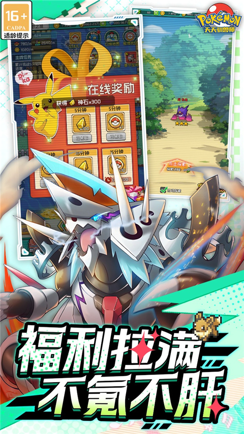 3、【冒险】精美特效全屏对战一触即发!加入精灵的世界,化身精灵训练师开启冒险!