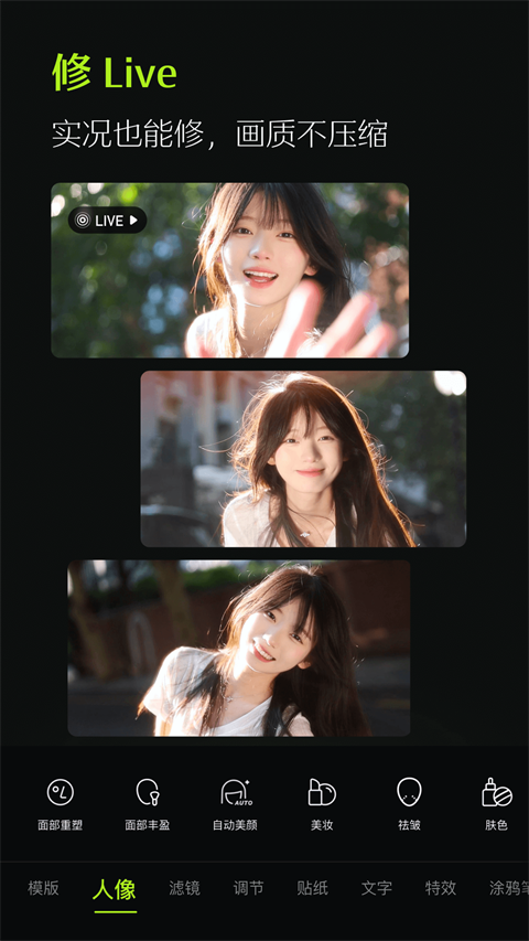 1、人像升级,get大片级美颜肤质,质感肤质,更高级。