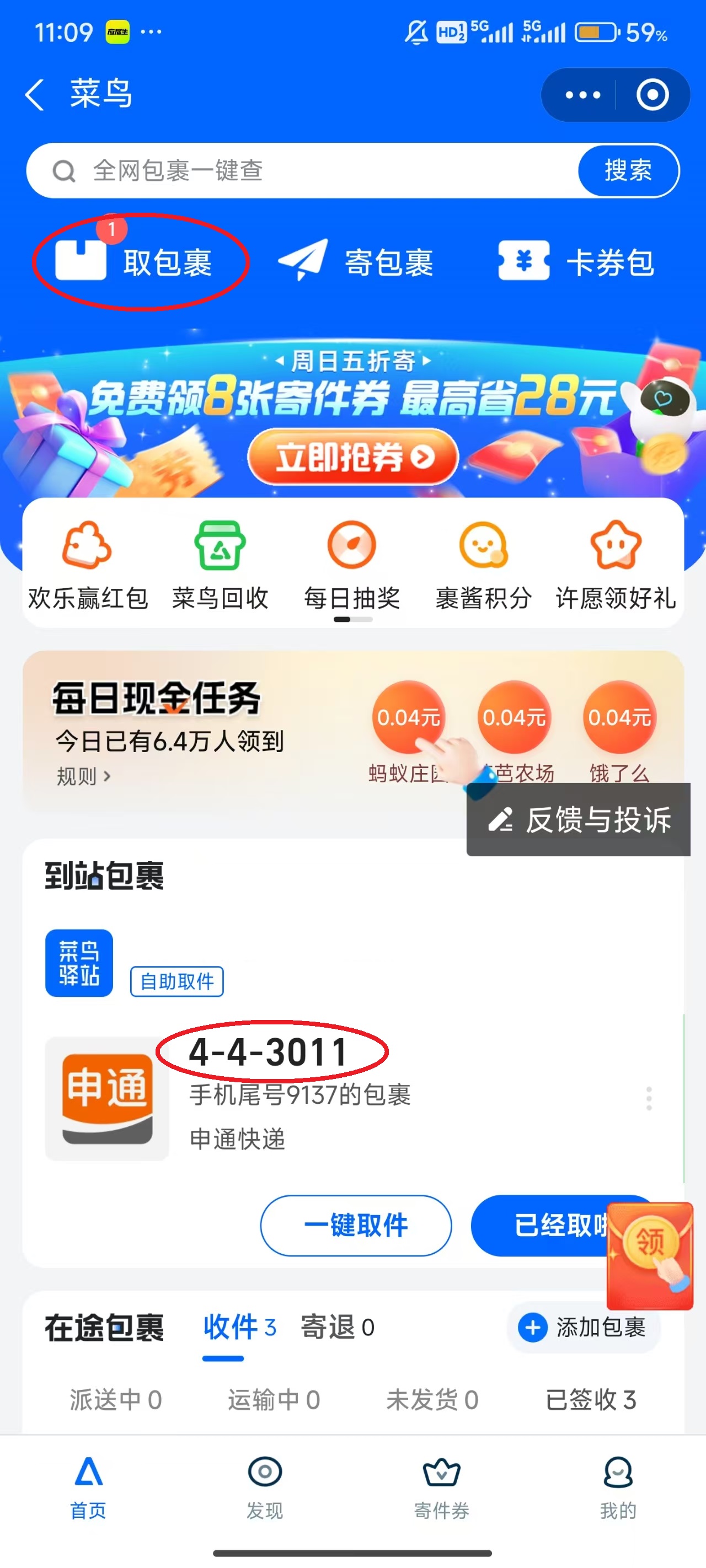 2、点击左上方的“取包裹”,或者自己看页面中间,也可以查看快递取件码。