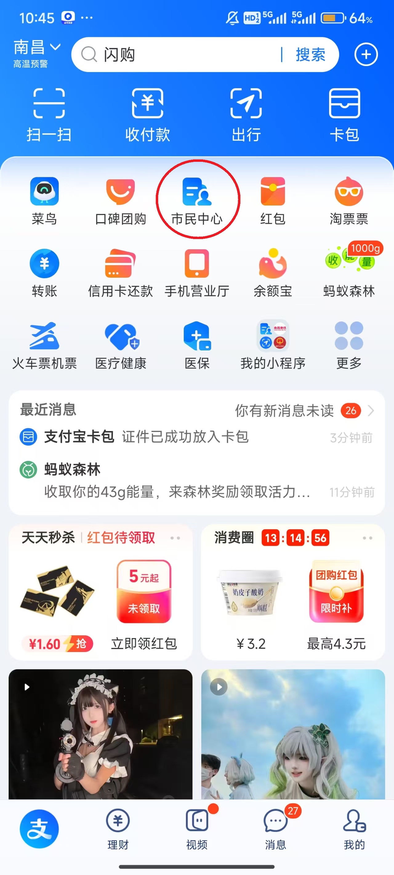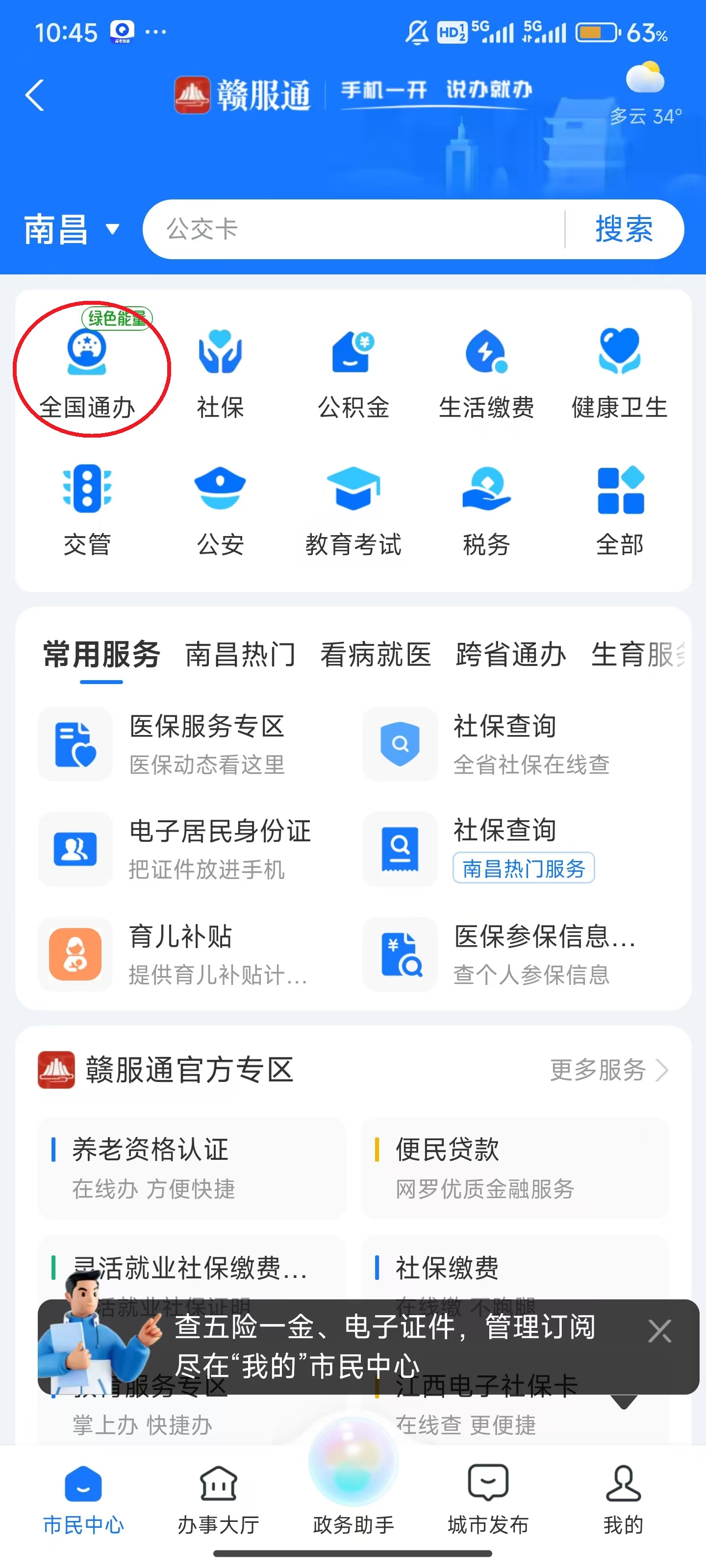 1、点击屏幕上方的“市民中心”。