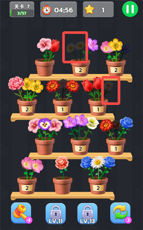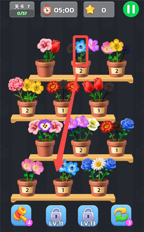1、打开插花小屋游戏,进入关卡中,要将三个相同的花放入同一花盆,将第一排中间的蓝色花放入最后一排中间的花盆,可进行消除合成。