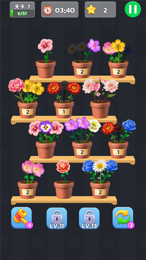 3、当花盆中已满,可以先将花盆中的花移入其他未满花盆,再将凑对的花移入。