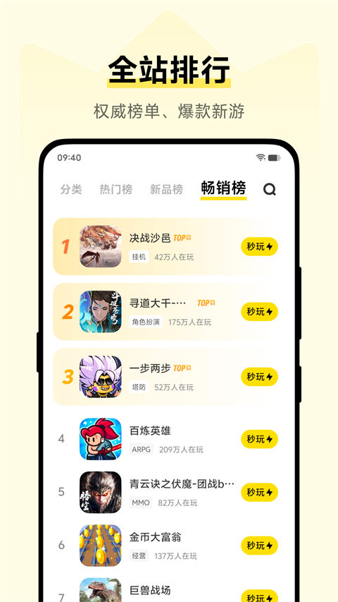 4、点开【排行】,提供了热门榜、新品榜,玩家可以根据榜单选择玩耍。