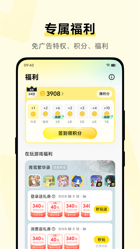 5、点开【福利】,玩家可以签到领金币、然后可以用金币兑换免广告的特权,让你玩游戏更加轻松。