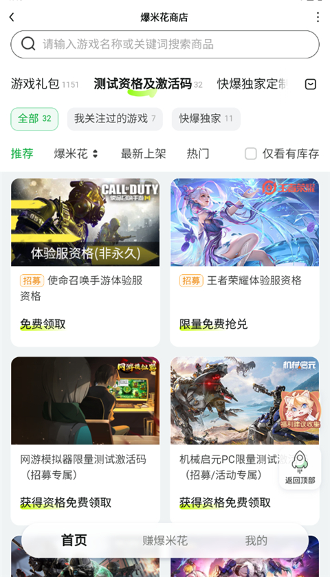 1、小伙伴们可以在【我的】-【爆米花商店】中使用爆米花兑换部分内测游戏的激活码。