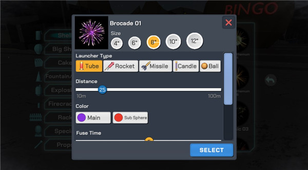 8、我们选择一个并点击,就会弹出这样一个界面,在这里可以选择烟花的大小、发射器的类型、烟花发射的距离、烟花引线燃烧的时间等等