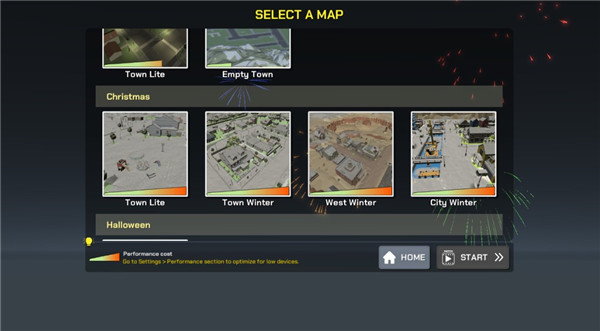 3、进入模式后,这里我们可以上下滑动,选择不同的地图去放烟花,选择好后点击start即可进入